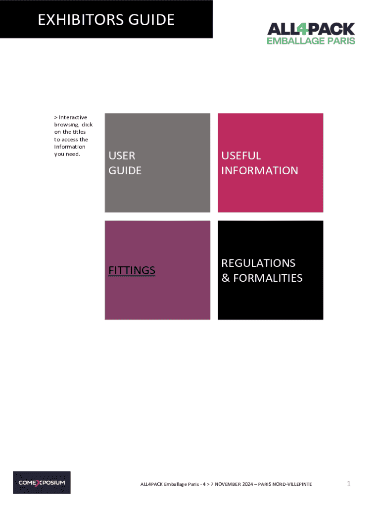 EXHIBITORS GUIDE Interactive browsing, click on the titles to access the information you need.USER GUIDEUSEFUL INFORMATIONFITTINGSREGULATIONS & FORMALITIESALL4PACK Emballage Paris 4 7 NOVEMBER 2024