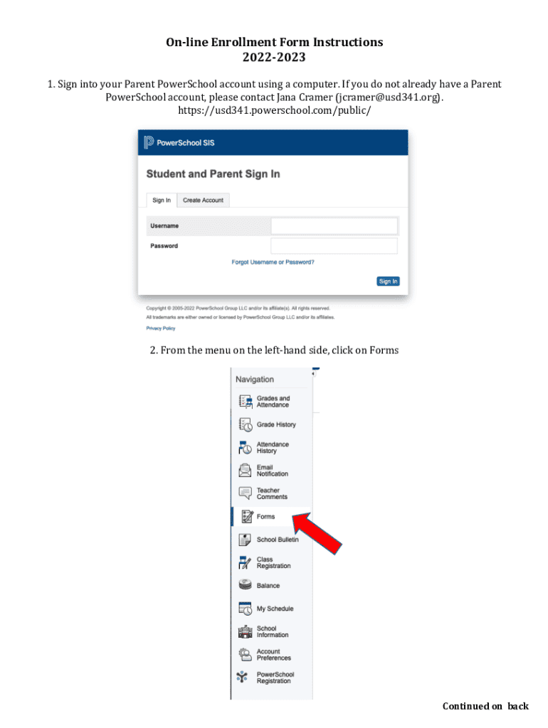 Instructions for signing into Parent PowerSchool and completing the online enrollment forms for the 2022-2023 academic year.