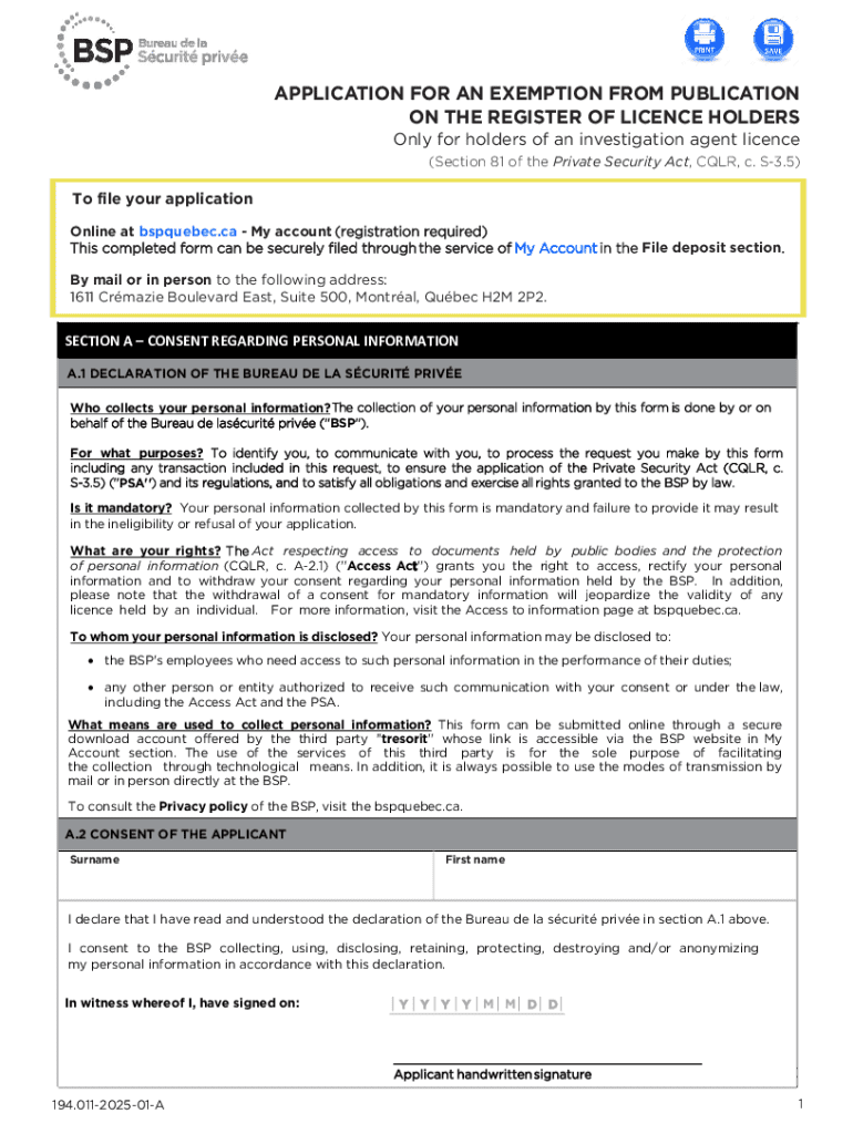 APPLICATION FOR AN EXEMPTION FROM PUBLICATION ON THE REGISTER OF LICENCE HOLDERSOnly for holders of an investigation agent licence (Section 81 of the Private Security Act, CQLR, c. S3.5)To file your