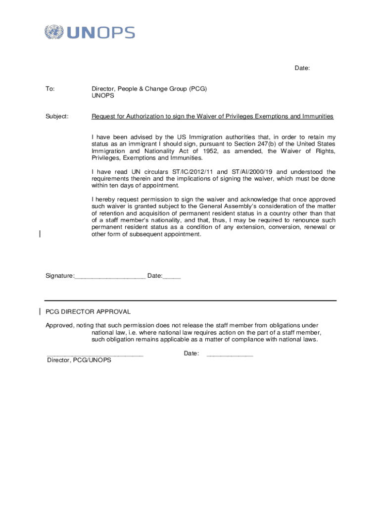 Date:To:Director, People & Change Group (PCG) UNOPSSubject:Request for Authorization to sign the Waiver of Privileges Exemptions and ImmunitiesI have been advised by the US Immigration authorities