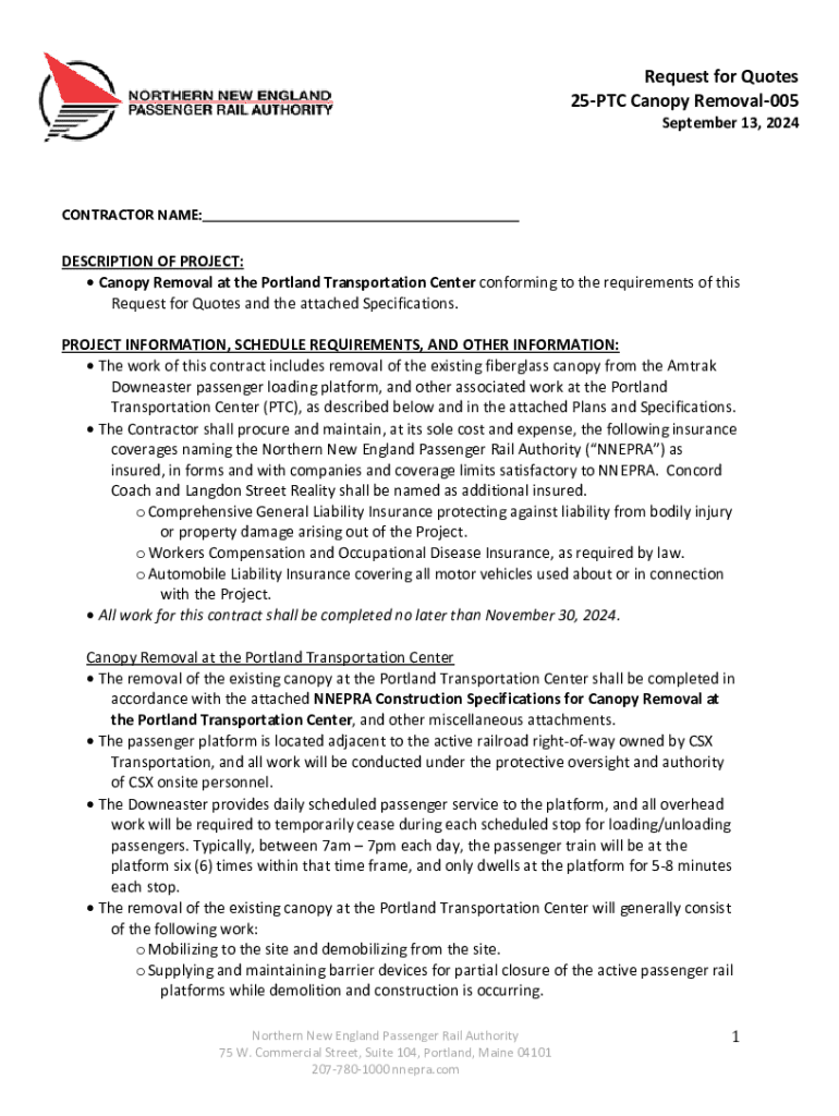 Request for Quotes 25PTC Canopy Removal005 September 13, 2024CONTRACTOR NAME: ___DESCRIPTION OF PROJECT: Canopy Removal at the Portland Transportation Center conforming to the requirements of this