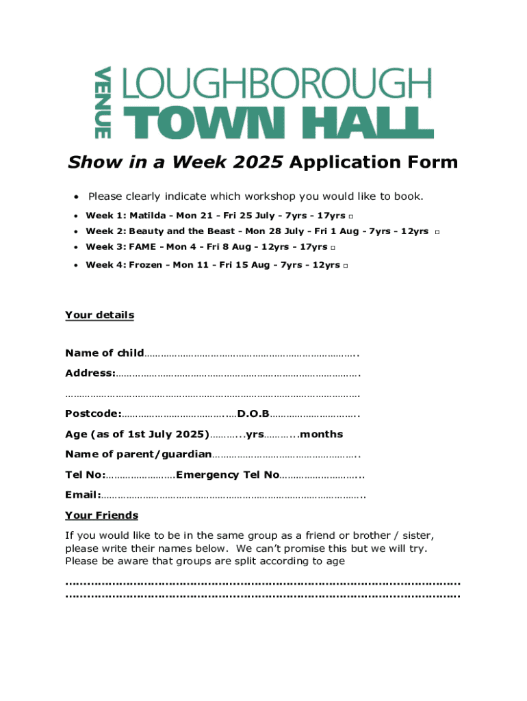 Application form for booking workshops for children aged 7 to 17 during the Show in a Week program in 2025.
