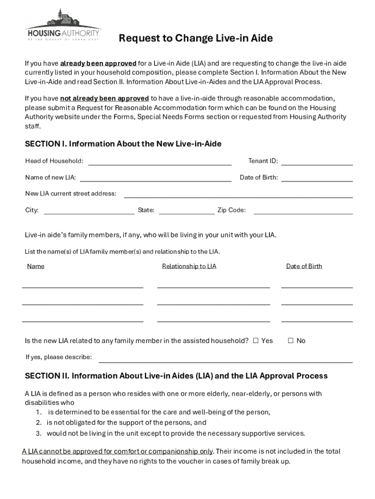 Request to Change Livein Aide If you have already been approved for a Livein Aide (LIA) and are requesting to change the livein aide currently listed in your household composition, please complete