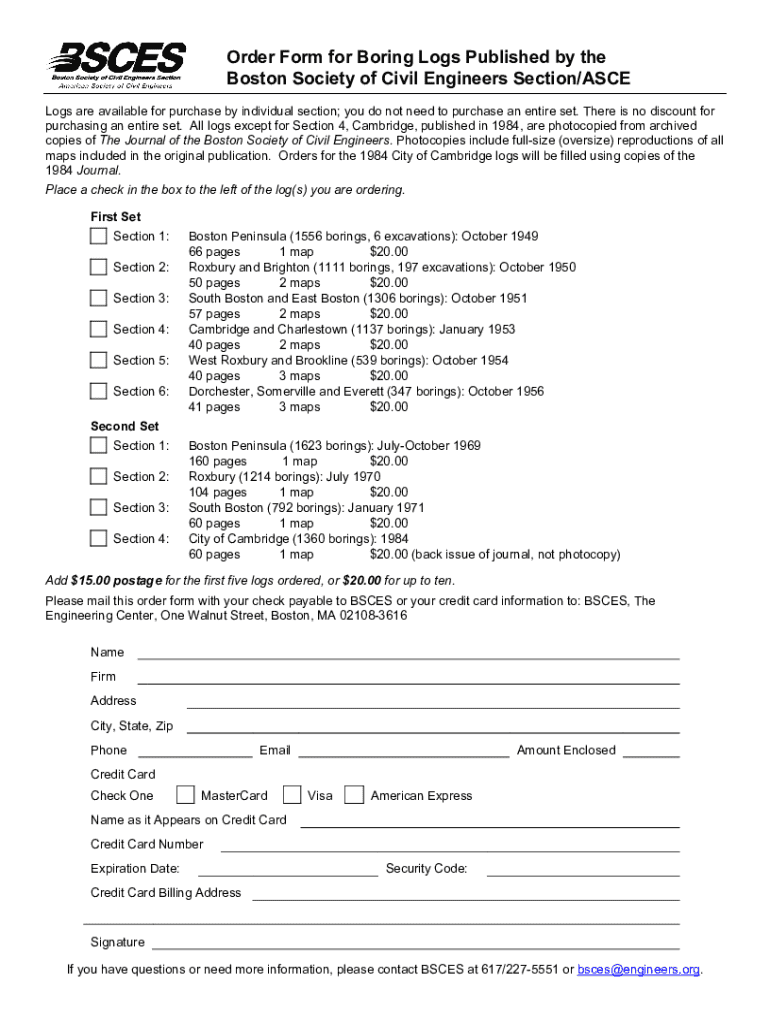 Purchasing individual boring logs published by the Boston Society of Civil Engineers Section/ASCE. The order form includes various sections available for purchase along with pricing and shipping information.