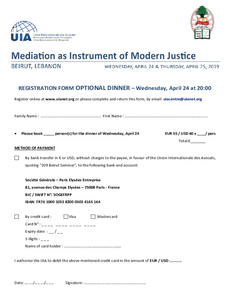 REGISTRATION FORM OPTIONAL DINNER Wednesday, April 24 at 20:00 Register online at www.uianet.org or please complete and return this form, by email: uiacentre@uianet.orgFamily Name : .........................................................