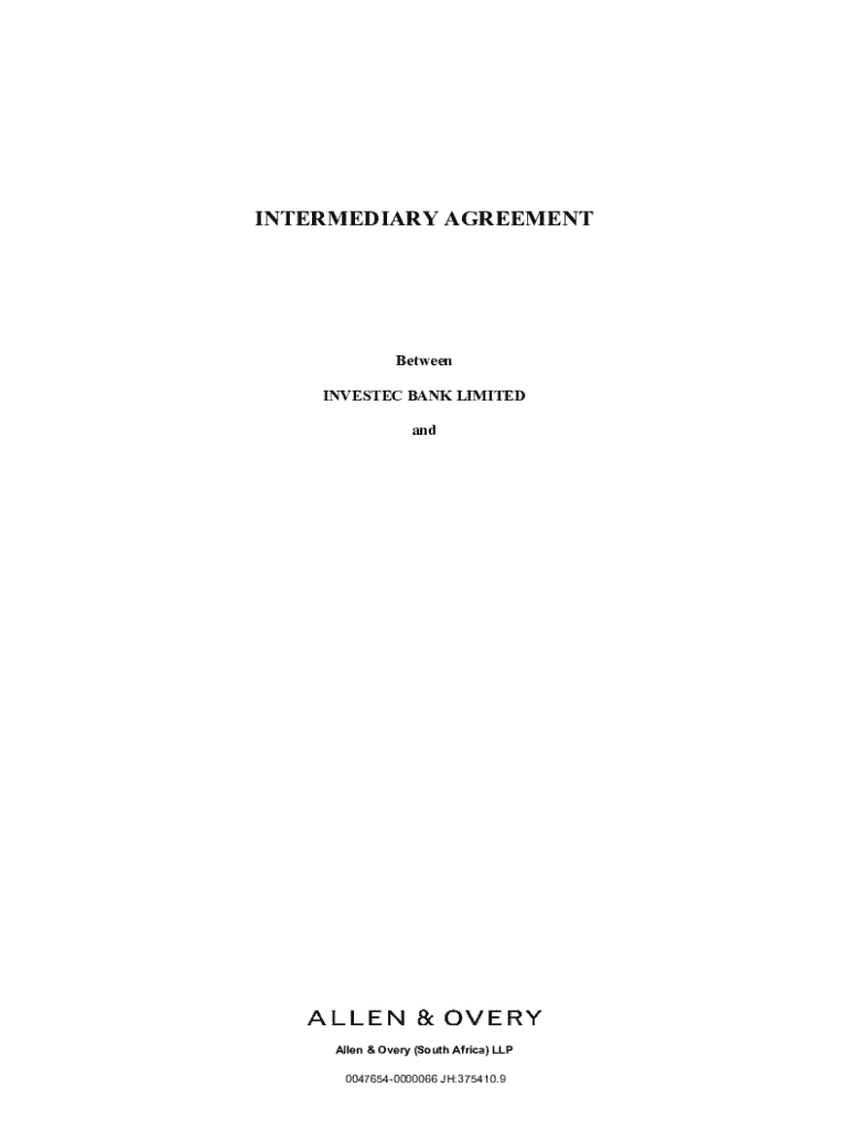 INTERMEDIARY AGREEMENTBetween INVESTEC BANK LIMITED andAllen & Overy (South Africa) LLP 00476540000066 JH:375410.9CONTENTS Clause 1. 2. 3. 4. 5. 6. 7. 8. 9. 10. 11. 12. 13. 14. 15. 16. 17. 18. 19.