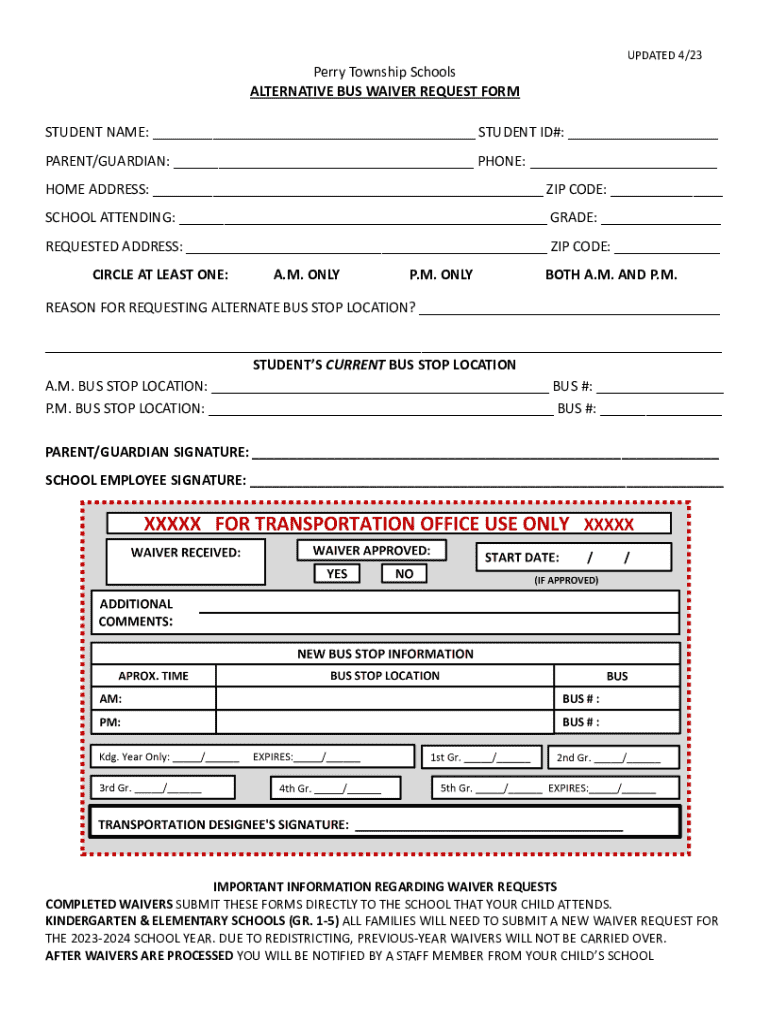 This form is used by parents or guardians to request an alternative bus stop location for their child attending Perry Township Schools. It requires details about the student, their current bus stop, and the requested address.