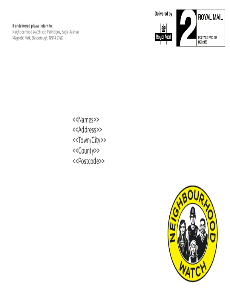 If undelivered please return to: Neighbourhood Watch, c/o Partridges, Eagle Avenue, Magnetic Park, Desborough, NN14 2WDNames Address Town/City County PostcodeLOGO 3.1 Colour1.The yellow roundel is