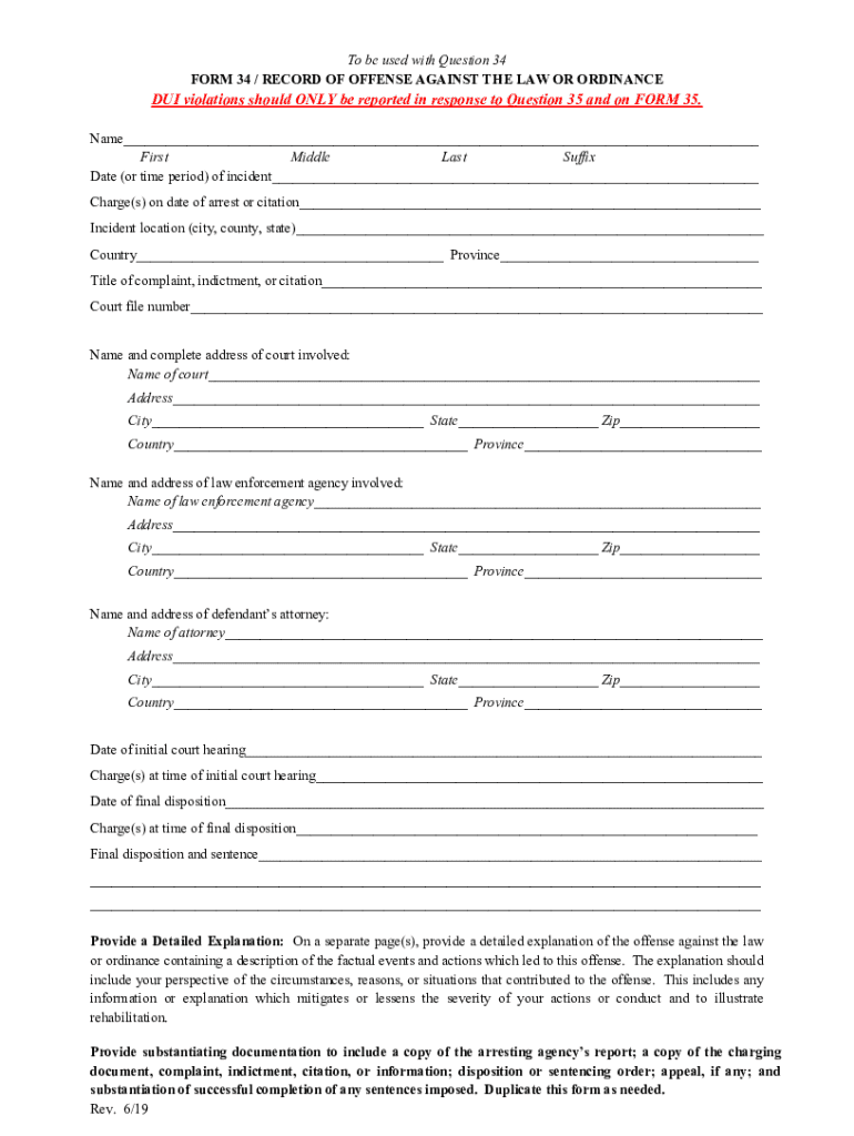 This form is used to document offenses against the law or ordinance, including details of the incident, charges, court involvement, law enforcement agency, and the defendant\'s attorney, as well as requirements for a detailed explanation of the circumstances surrounding the offense.