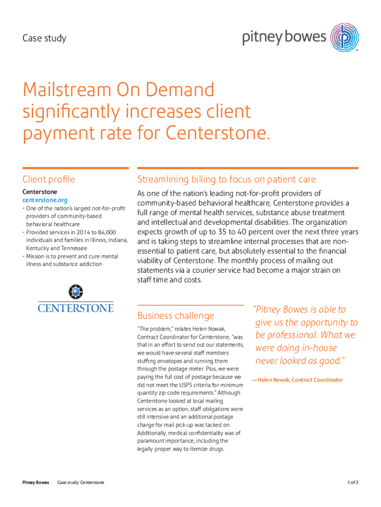 Case studyMailstream On Demand significantly increases client payment rate for Centerstone. Client profileStreamlining billing to focus on patient careCenterstone centerstone.orgAs one of the nations