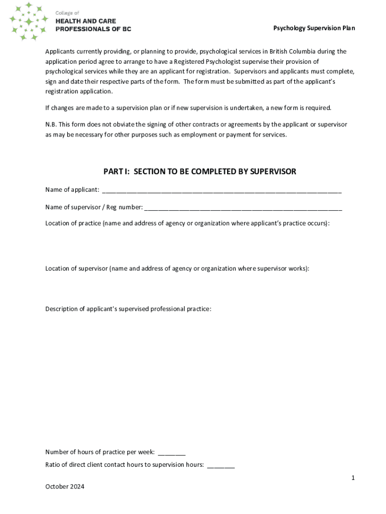 Psychology Supervision Plan Applicants currently providing, or planning to provide, psychological services in British Columbia during the application period agree to arrange to have a Registered Psychologist