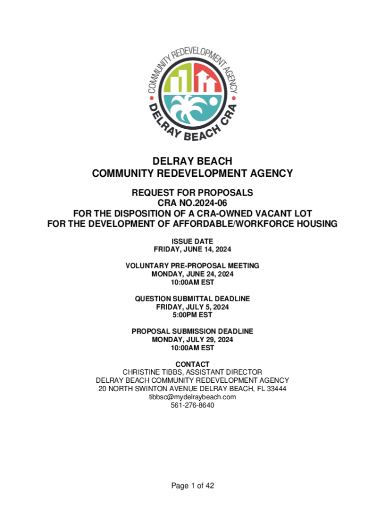 DELRAY BEACH COMMUNITY REDEVELOPMENT AGENCY REQUEST FOR PROPOSALS CRA NO.202406 FOR THE DISPOSITION OF A CRAOWNED VACANT LOT FOR THE DEVELOPMENT OF AFFORDABLE/WORKFORCE HOUSING ISSUE DATE FRIDAY,