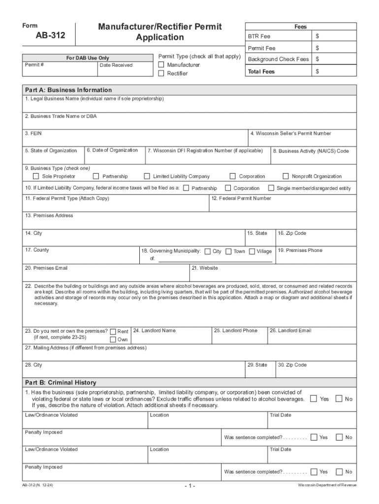 This application is for obtaining a permit to manufacture or rectify intoxicating liquor in Wisconsin. It includes sections for business information, criminal history, associated individuals, interest restrictions, and attestation. Applicants must provide details regarding their business structure, any affiliations with other alcohol-related businesses, and certify truthful completion of the application.