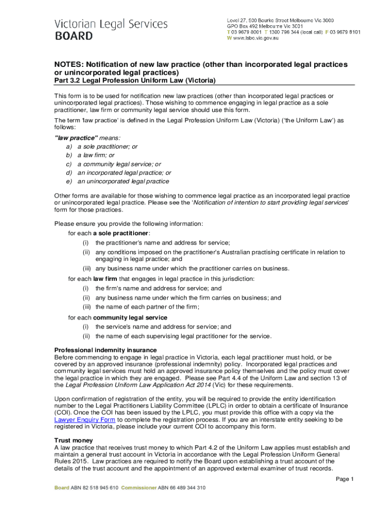 NOTES: Notification of new law practice (other than incorporated legal practices or unincorporated legal practices) Part 3.2 Legal Profession Uniform Law (Victoria) This form is to be used for notification