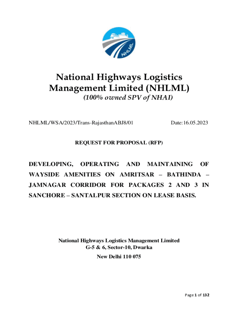 This document outlines the Request for Proposal (RFP) by the National Highways Logistics Management Limited (NHLML) for the development, operation, and maintenance of wayside amenities along the Amritsar – Bathinda – Jamnagar corridor. It includes instructions for bidders, project scope, eligibility criteria, and other pertinent details for interested parties to submit their proposals.