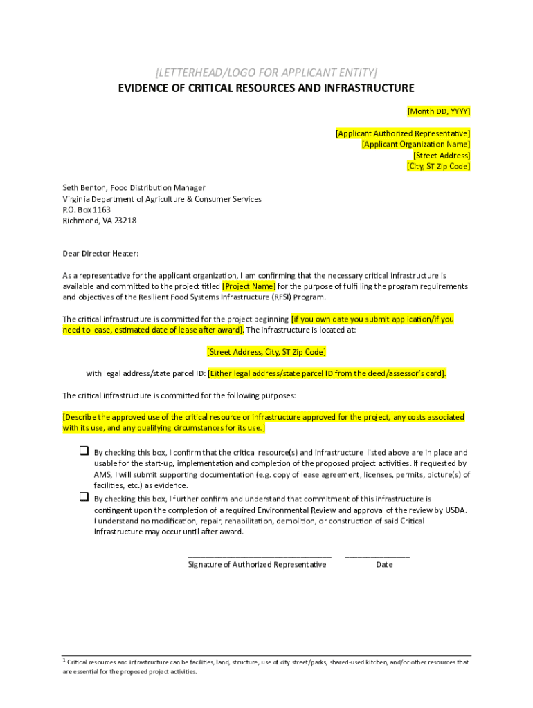 [LETTERHEAD/LOGO FOR APPLICANT ENTITY] EVIDENCE OF CRITICAL RESOURCES AND INFRASTRUCTURE [Month DD, YYYY] [Applicant Authorized Representave] [Applicant Organizaon Name] [Street Address] [City, ST