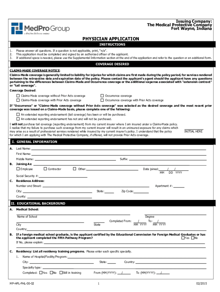 Issuing Company: The Medical Protective Company Fort Wayne, IndianaPHYSICIAN APPLICATION INSTRUCTIONS 1. 2. 3.Please answer all questions. If a question is not applicable, print, n/a. This application
