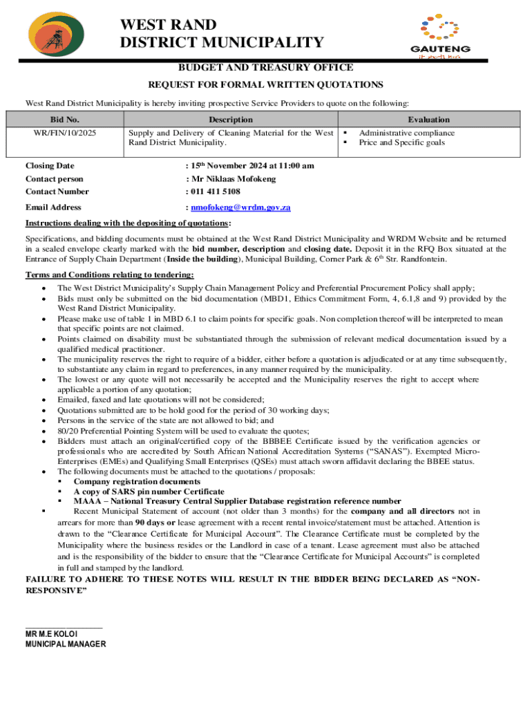WEST RAND DISTRICT MUNICIPALITY BUDGET AND TREASURY OFFICE REQUEST FOR FORMAL WRITTEN QUOTATIONS West Rand District Municipality is hereby inviting prospective Service Providers to quote on the following: