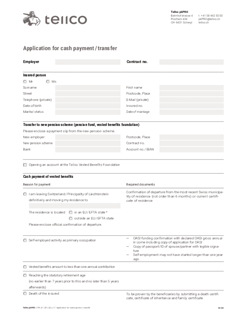 This document is an application form for cash payments or transfers from the Tellco Vested Benefits Foundation. It is intended for insured persons who are leaving Switzerland or the Principality of Liechtenstein and wish to transfer their vested benefits to a new pension scheme. The form requires personal information, reasons for cash payment, and necessary documentation depending on the marital status and purpose of withdrawal.