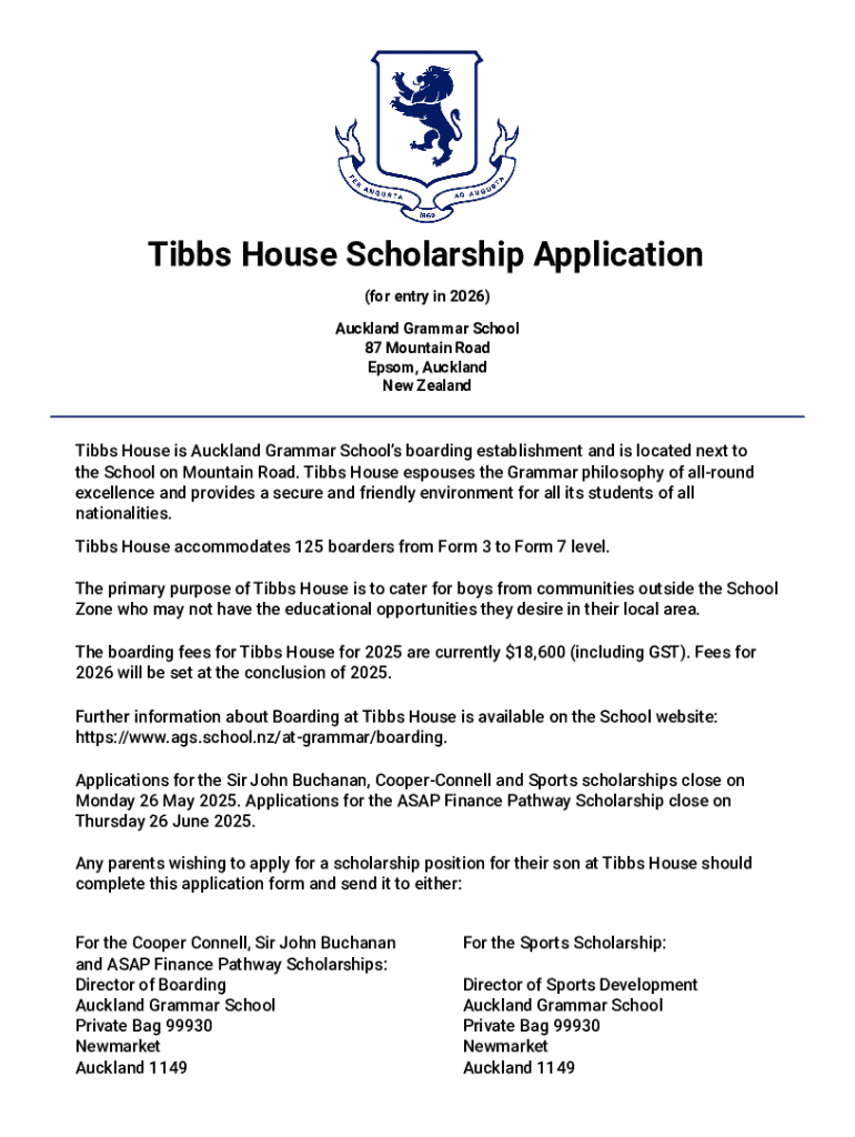 The Tibbs House Scholarship Application is designed for prospective students applying for a scholarship to attend Auckland Grammar School\'s Tibbs House boarding facility, catering to boys from communities outside the School Zone. The application includes personal details of the student, family information, scholarship selection, interests, and medical details, among other aspects, to be completed by either parents or the student.