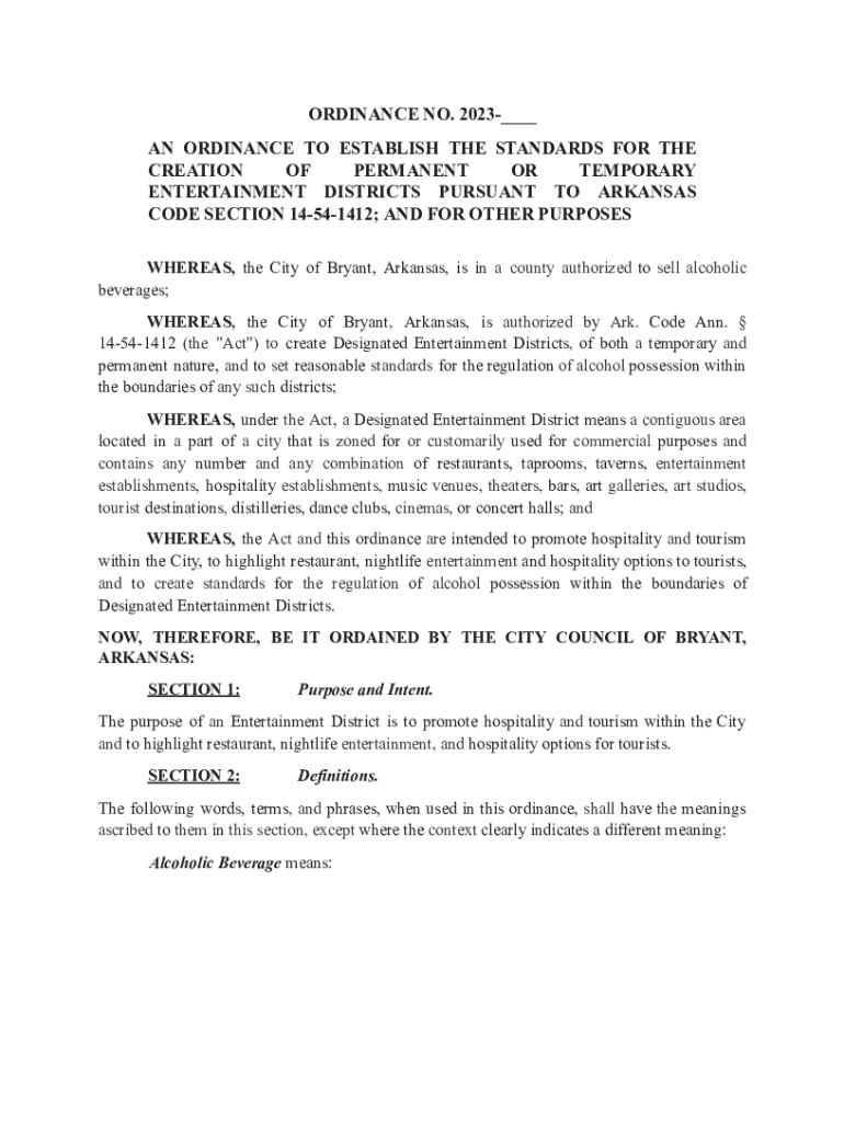 ORDINANCE NO. 2023___ AN ORDINANCE TO ESTABLISH THE STANDARDS FOR THE CREATION OF PERMANENT OR TEMPORARY ENTERTAINMENT DISTRICTS PURSUANT TO ARKANSAS CODE SECTION 14541412; AND FOR OTHER PURPOSES