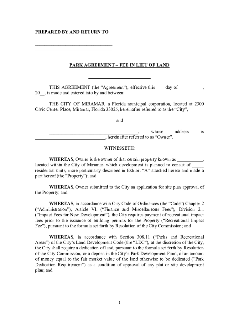PREPARED BY AND RETURN TO ___ ___ ___ PARK AGREEMENT FEE IN LIEU OF LAND ___ ___ THIS AGREEMENT (the Agreement), effective this ___ day of ___, 20__, is made and entered into by and between: THE CITY