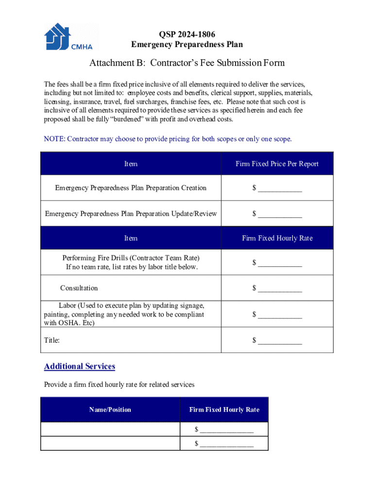 QSP 20241806 Emergency Preparedness PlanAttachment B: Contractors Fee Submission Form The fees shall be a firm fixed price inclusive of all elements required to deliver the services, including but