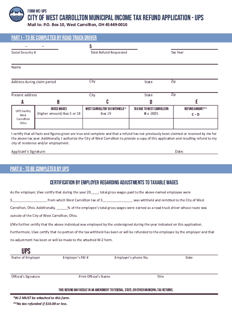 This document serves as an application for a municipal income tax refund for road truck drivers employed at the UPS facility in West Carrollton, Ohio. It requires completion by the driver and their employer to verify tax withholdings and gross wages, ensuring that the application is submitted with the necessary W-2 documentation.