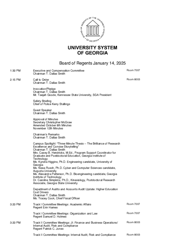 Board of Regents January 14, 2025 1:30 PMExecutive and Compensation Committee Chairman T. Dallas SmithRoom 70072:15 PMCall to Order Chairman T. Dallas SmithRoom 8003Invocation/Pledge Chairman T. Dallas