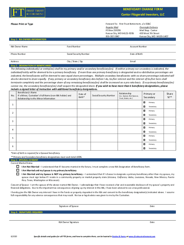 BENEFICIARY CHANGE FORM Cantor Fitzgerald Investors, LLC Please Print or TypeForward To: First Trust Retirement, c/o SS&C Regular Mail Overnight Delivery PO Box 219206 Mail Stop: Cantor Kansas City,
