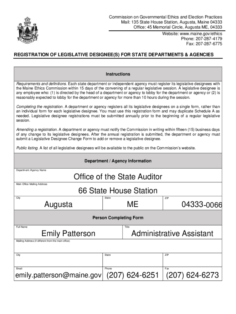 This document serves as a registration form for state departments and independent agencies to register their legislative designees with the Maine Ethics Commission. It outlines the requirements, process for registration, and amending registrations, as well as provides department/agency information and related contact details.