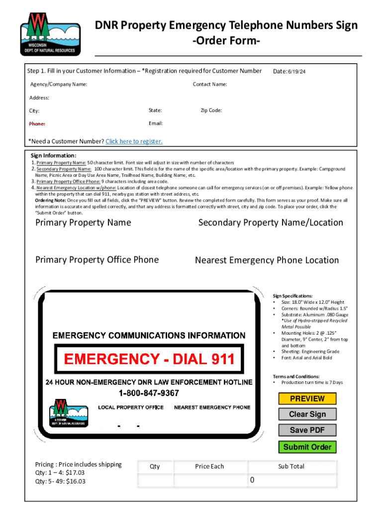 This form allows customers to provide necessary information for ordering a DNR Property Emergency Telephone Numbers Sign, including details such as property names, phone numbers, and emergency location information. The form also includes specifications for the sign and ordering instructions.