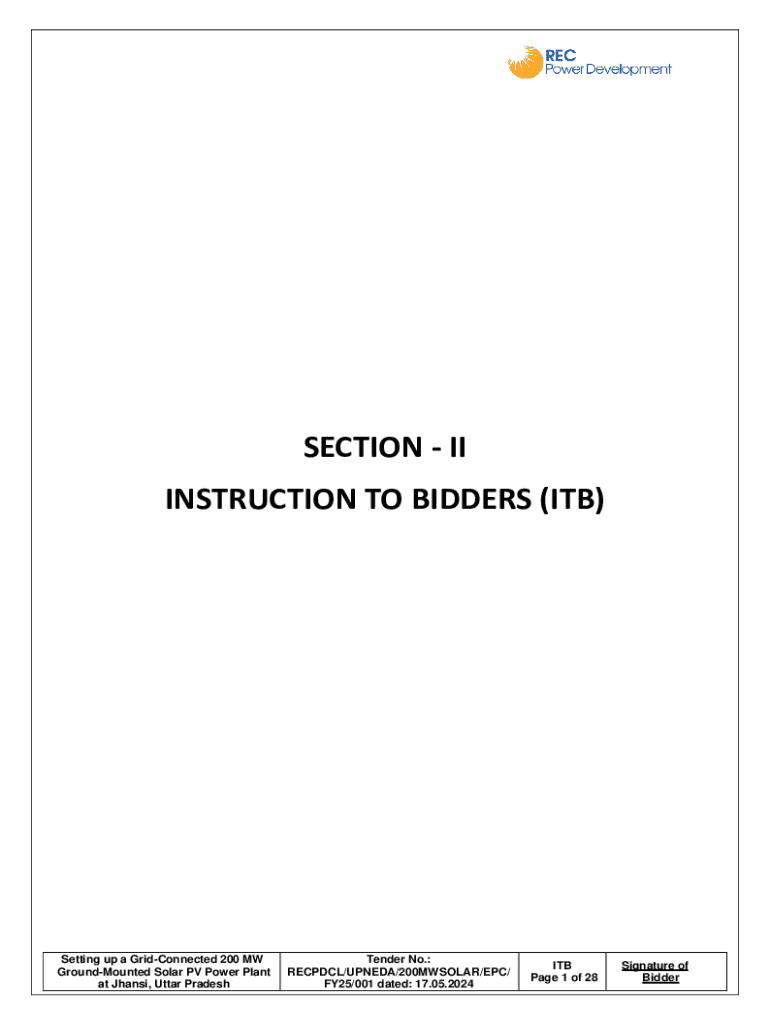 SECTION II INSTRUCTION TO BIDDERS (ITB)Setting up a GridConnected 200 MW GroundMounted Solar PV Power Plant at Jhansi, Uttar PradeshTender No.: RECPDCL/UPNEDA/200MWSOLAR/EPC/ FY25/001 dated: 17.05.2024ITB
