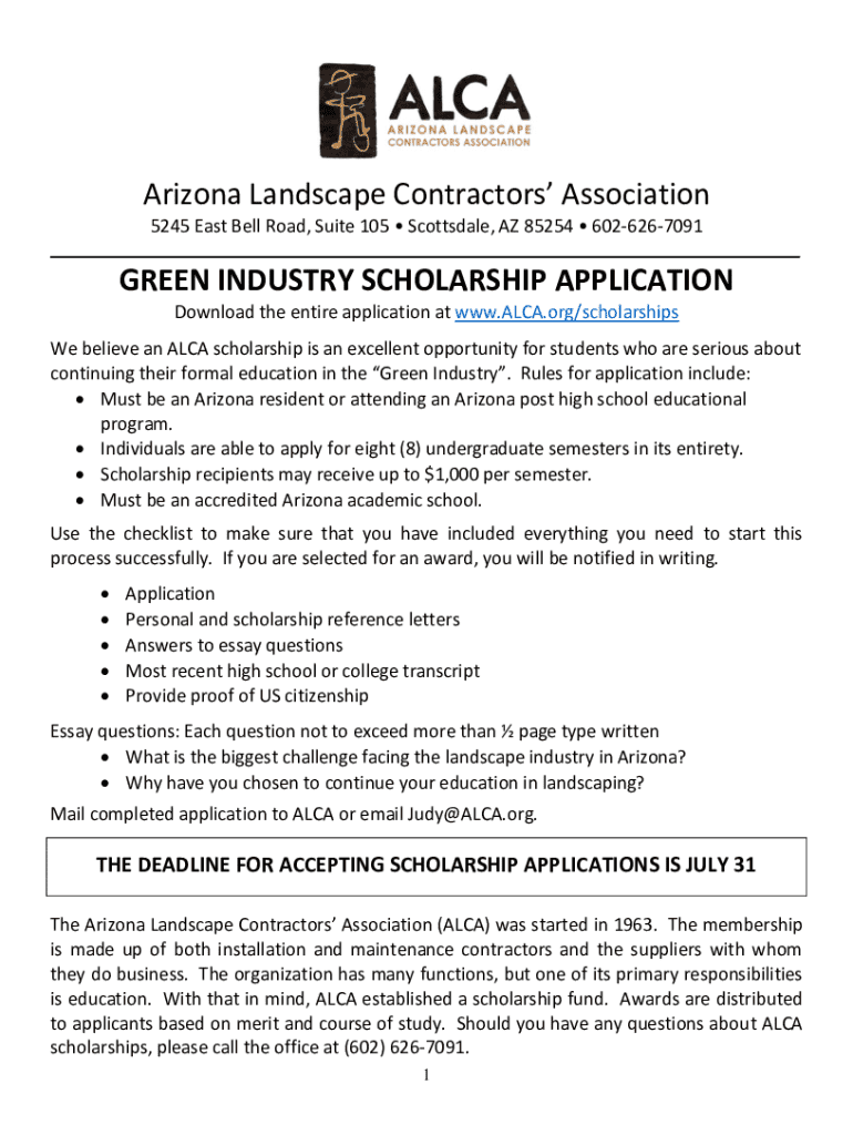 Application form for the Arizona Landscape Contractors’ Association (ALCA) Green Industry Scholarship aimed at supporting students pursuing education in landscaping.