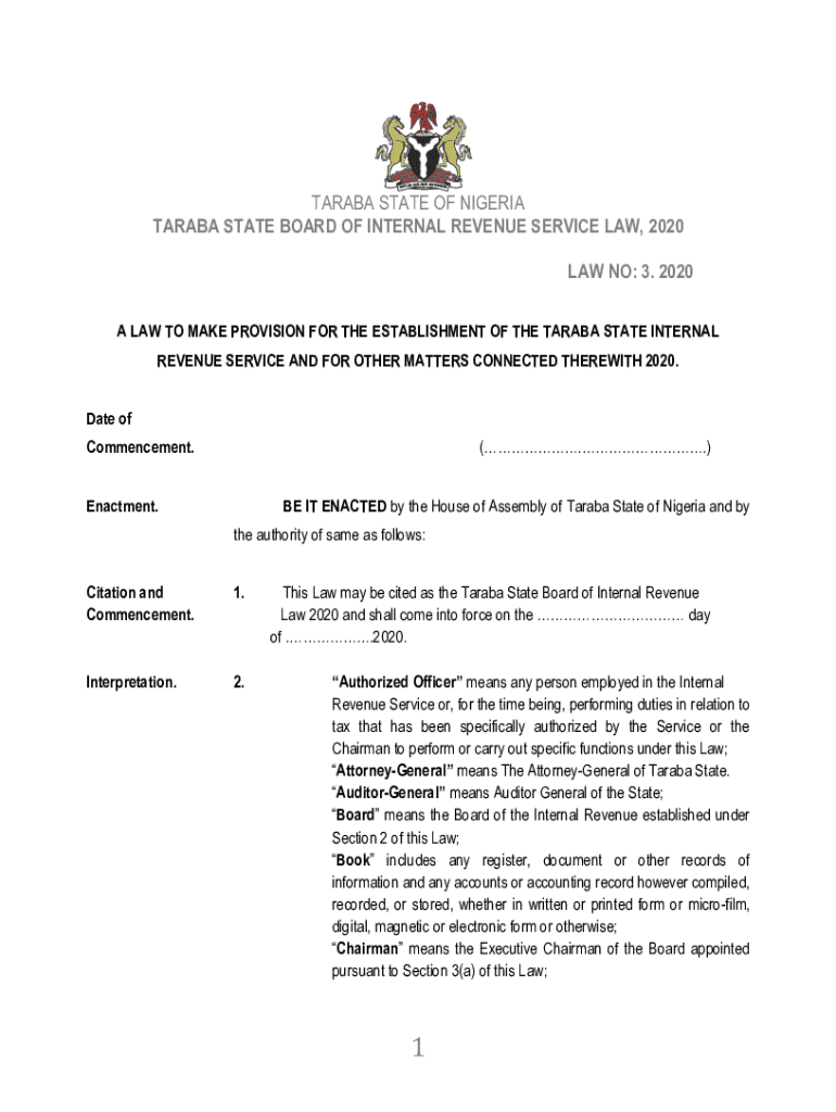 TARABA STATE OF NIGERIA TARABA STATE BOARD OF INTERNAL REVENUE SERVICE LAW, 2020 LAW NO: 3. 2020 A LAW TO MAKE PROVISION FOR THE ESTABLISHMENT OF THE TARABA STATE INTERNAL REVENUE SERVICE AND FOR