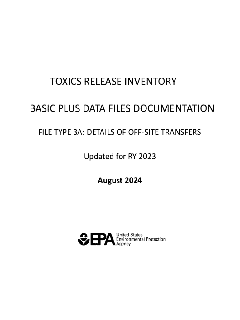This document provides an overview and detailed description of File Type 3A from the TRI Basic Plus data files, which contains off-site transfer data from Section 6.2 of the TRI Reporting Form R. It outlines the structure and content of these files, referencing relevant sections and codes for accurate data interpretation.