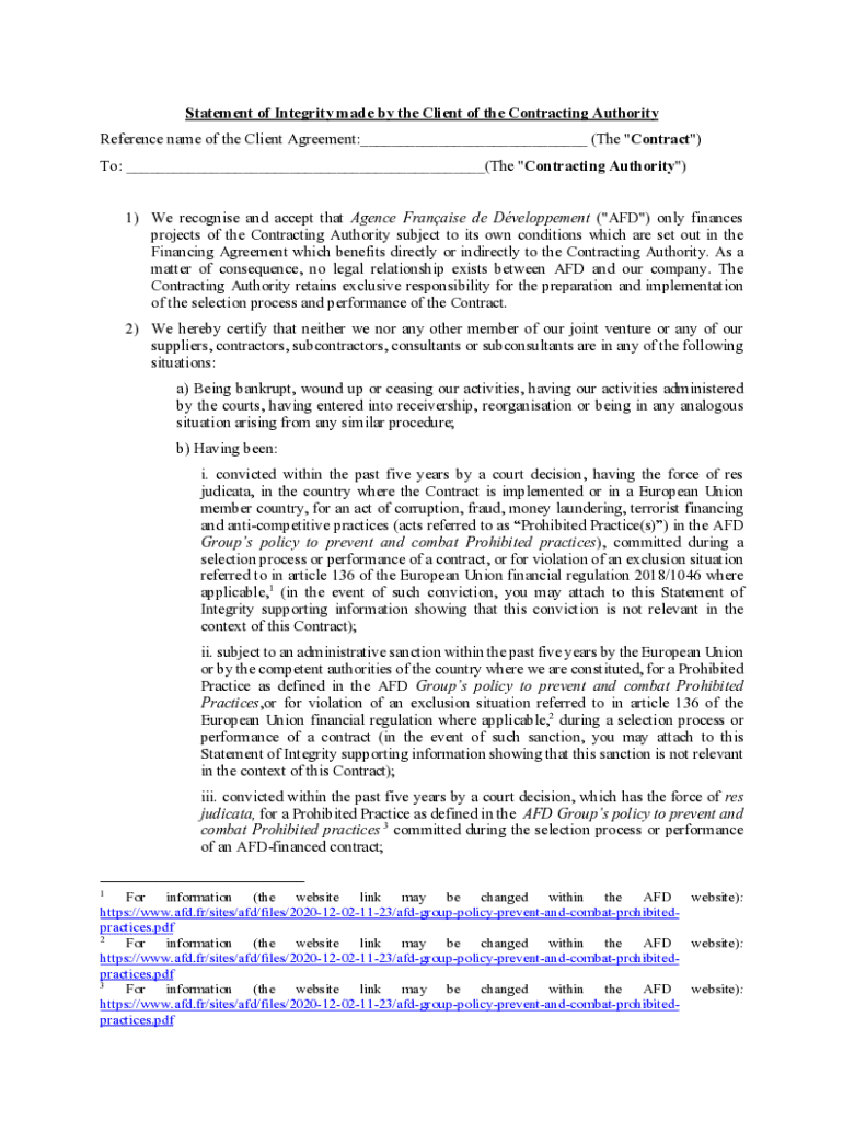 This document is a Statement of Integrity wherein the client of the Contracting Authority certifies their compliance with various legal and ethical standards, including but not limited to non-engagement in prohibited practices, conflict of interest disclosures, and various certifications of financial integrity. It is a formal declaration to ensure transparency and accountability in the execution of the contract with AFD.