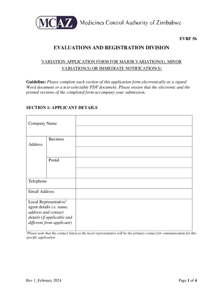 This form is used to apply for major or minor variations to registered medicines, including immediate notifications. It includes sections for applicant details, product information, a documentation checklist, and a declaration.