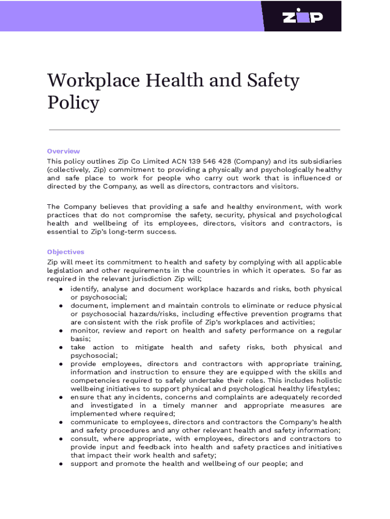 This policy outlines Zip Co Limited\'s commitment to providing a safe and healthy work environment for its employees, directors, contractors, and visitors, addressing both physical and psychological health and safety.