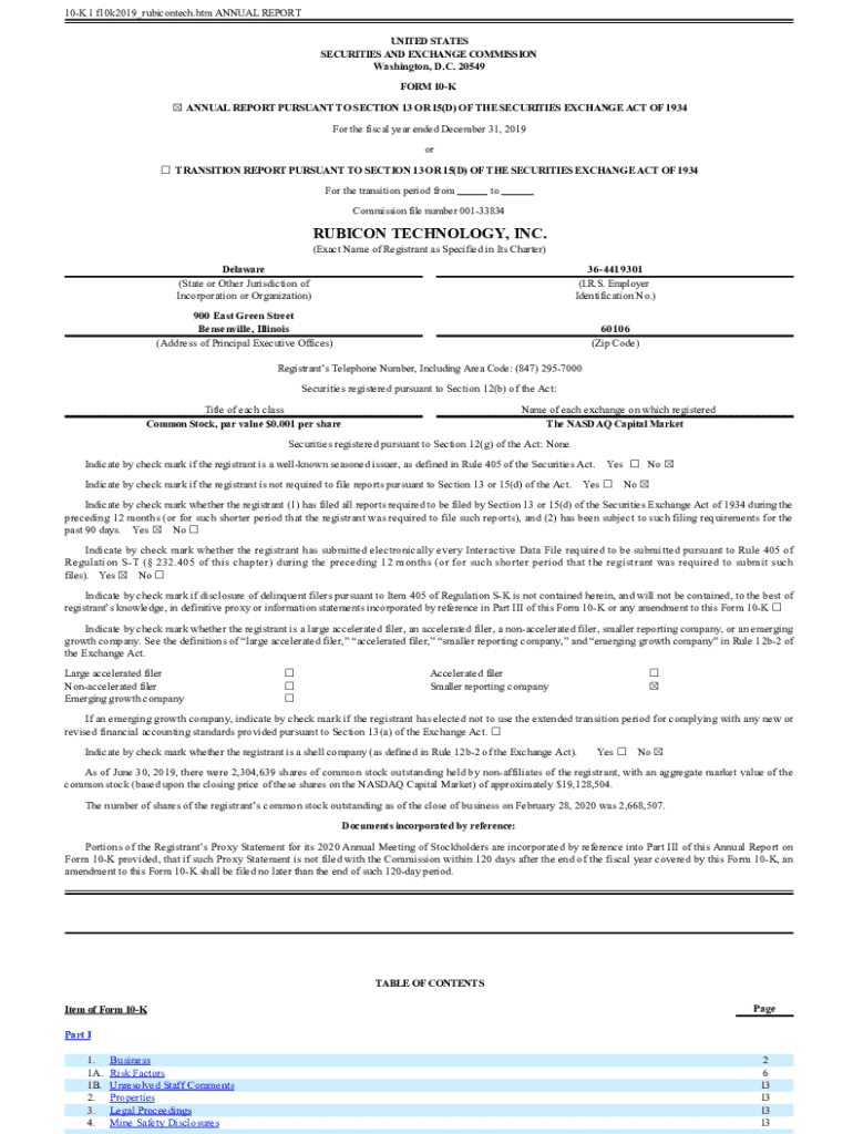 This document is the Annual Report on Form 10-K for Rubicon Technology, Inc. for the fiscal year ended December 31, 2019, filed with the United States Securities and Exchange Commission. It includes detailed information about the company’s financial performance, risks, business operations, and management discussions, as well as information required by the SEC for public companies.