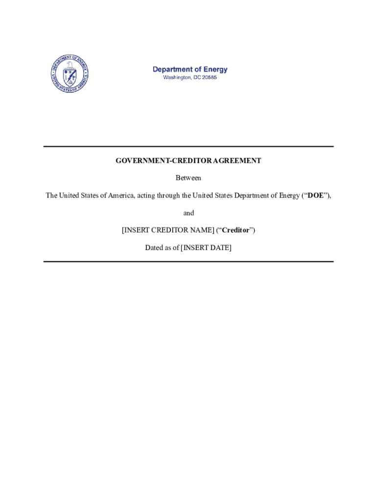 GOVERNMENTCREDITOR AGREEMENT Between The United States of America, acting through the United States Department of Energy (DOE), and [INSERT CREDITOR NAME] (Creditor) Dated as of [INSERT DATE]GOVERNMENTCREDITOR