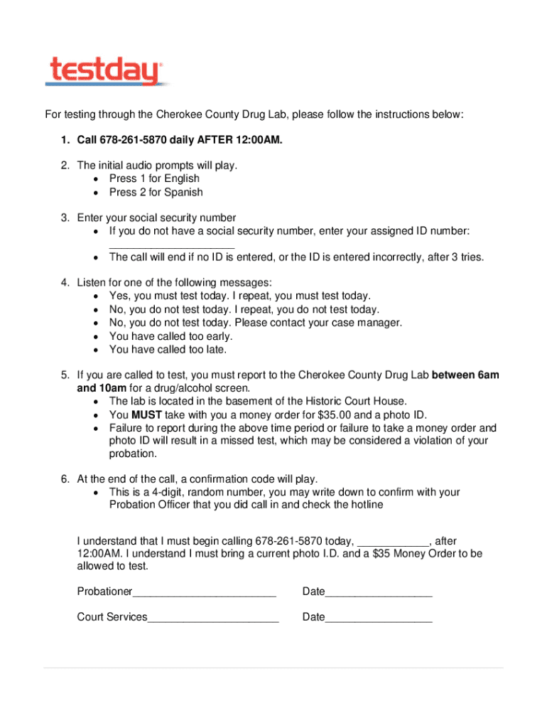 For testing through the Cherokee County Drug Lab, please follow the instructions below: 1. Call 6782615870 daily AFTER 12:00AM. 2. The initial audio prompts will play. Press 1 for English Press 2