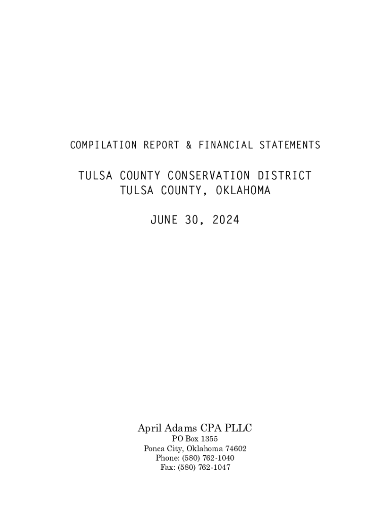 COMPILATION REPORT & FINANCIAL STATEMENTSTULSA COUNTY CONSERVATION DISTRICT TULSA COUNTY, OKLAHOMA JUNE 30, 2024April Adams CPA PLLC PO Box 1355 Ponca City, Oklahoma 74602 Phone: (580) 7621040 Fax: