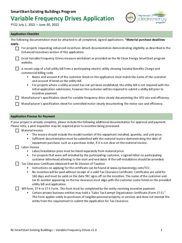 This document outlines the application process for obtaining incentives for Variable Frequency Drives under the SmartStart Existing Buildings program in New Jersey for the fiscal year 2022. It details eligibility requirements, documentation needed, and the application checklist. The program aims to promote energy efficiency through the purchase and installation of certain equipment, with specific deadlines and enhanced incentives for qualifying entities.