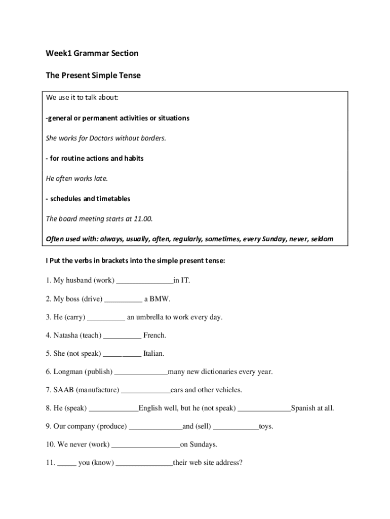 Week1 Grammar Section The Present Simple Tense We use it to talk about: general or permanent activities or situations She works for Doctors without borders. for routine actions and habits He often