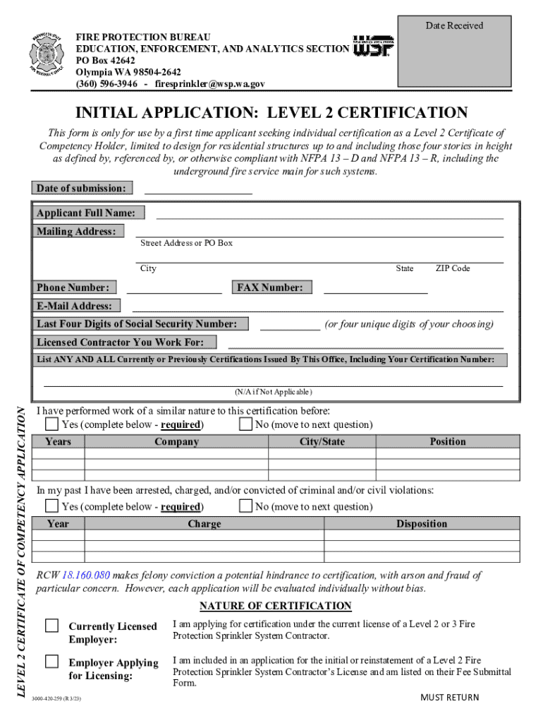 This document is an application for certification as a Level 2 Certificate of Competency Holder in the field of fire protection sprinkler systems. It includes requirements for qualifications, submission instructions, and an affirmation of compliance. Applicants must provide employment verification, governmental identification, and satisfy application fee requirements.