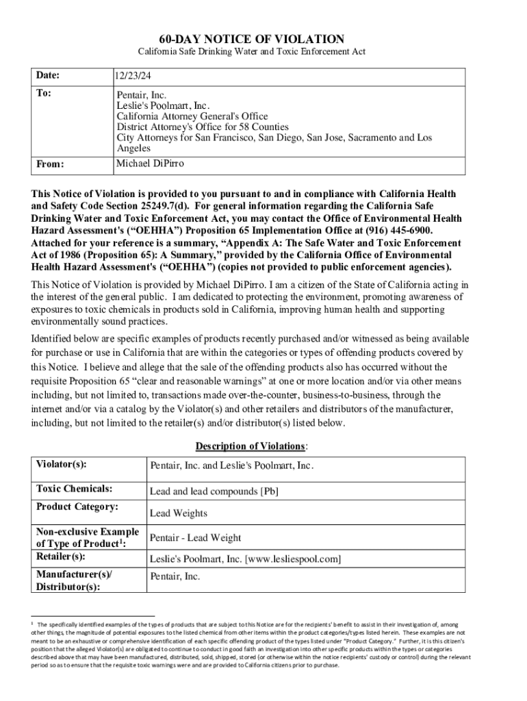 60DAY NOTICE OF VIOLATIONCalifornia Safe Drinking Water and Toxic Enforcement ActDate: To:From:12/23/24 Pentair, Inc. Leslie\'s Poolmart, Inc. California Attorney General\'s Office District Attorney\'s