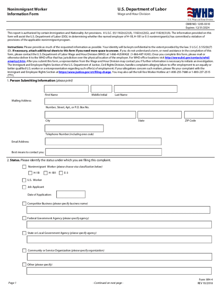 U.S. Department of LaborNonimmigrant Worker Information FormWage and Hour Division OMB NO: 12050310 Expires: 12/31/2024This report is authorized by certain Immigration and Nationality Act provisions.