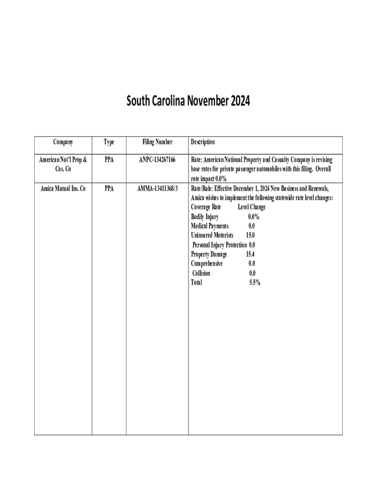 South Carolina November 2024 CompanyTypeFiling NumberAmerican Natl Prop & Cas. CoPPAANPC134267166Amica Mutual Ins. CoPPAAMMA13411368/3Description Rate: American National Property and Casualty Company