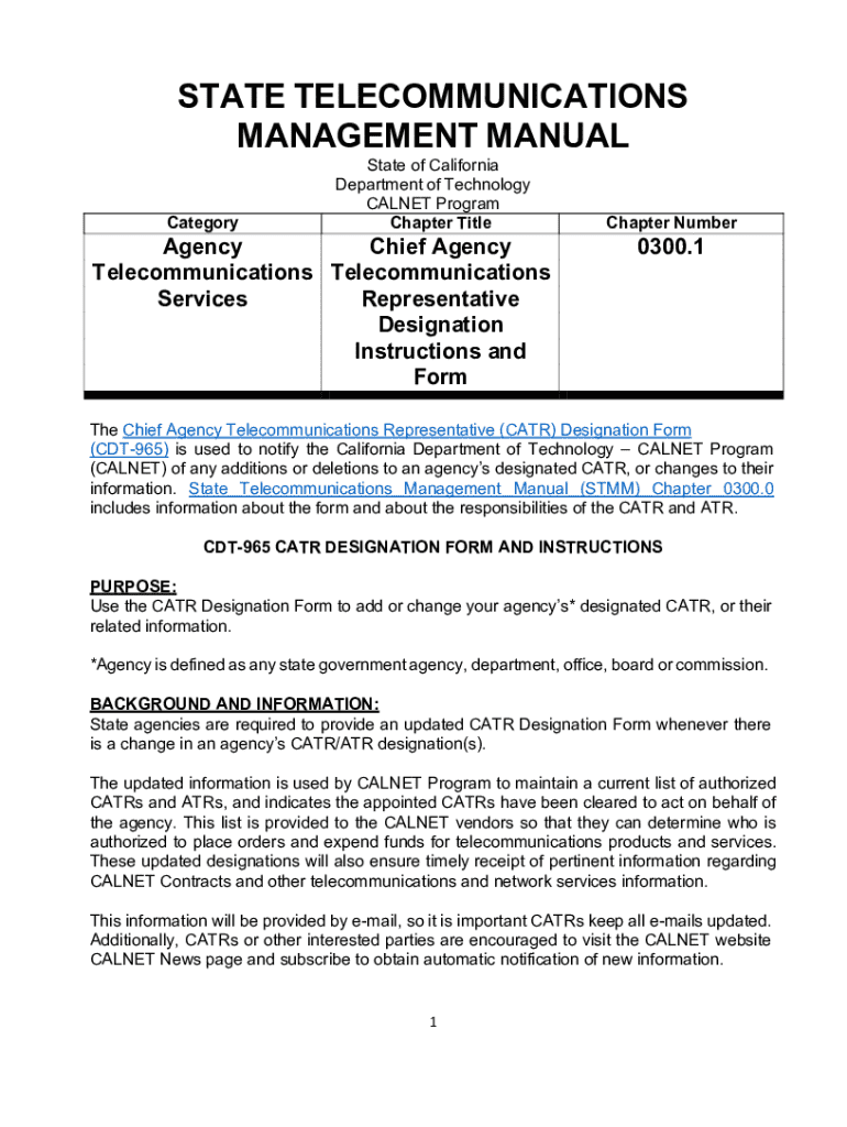 STATE TELECOMMUNICATIONS MANAGEMENT MANUAL CategoryState of California Department of Technology CALNET Program Chapter TitleAgency Chief Agency Telecommunications Telecommunications Services Representative
